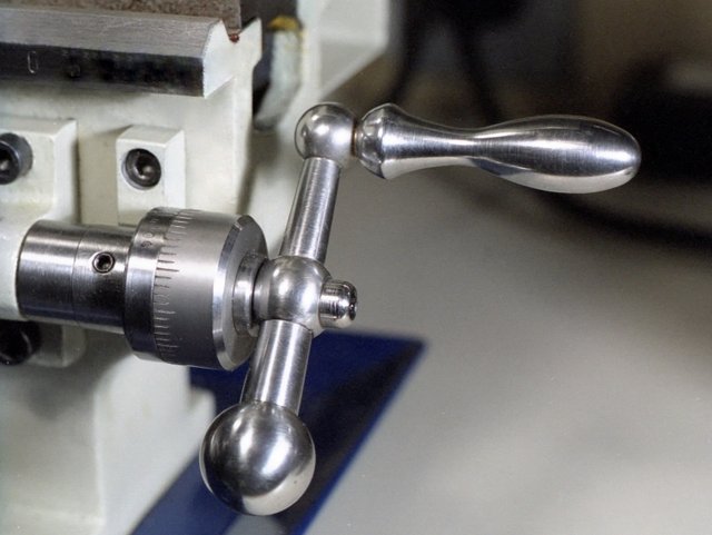 Here is a ball handle crank that I made along with a graduated collar for the end of the leadscrew. It is a welcome addition when precise longitudinal movements of the carriage are required.