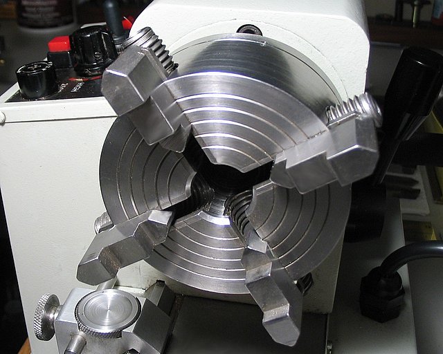 This next photo shows a Taig four-jaw chuck that has been modified and made to fit the headstock spindle in the same fashion as the stock three-jaw, self-centering chuck. The hole through the chuck was bored out to 3/4" diameter to match the spindle hole and extra centering grooves were cut in the face.