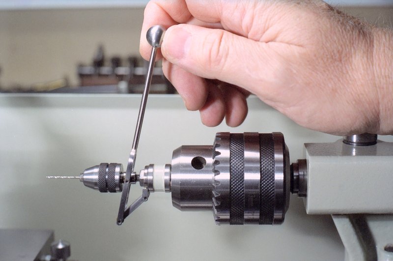 The photo below shows a sensitive drilling attachment. When needed it is simply placed in the large 1/2" drill chuck, which in turn is mounted with a No. 2 Morse Taper in the tailstock ram. The little chuck is a slightly-modified Dremel unit and holds bits up to 1/8" in diameter. Being a steam engine enthusiast, I made the sliding shaft enter through a graphite-yarn packed gland. It keeps it clean, smooth-operating and provides adjustable drag when required.