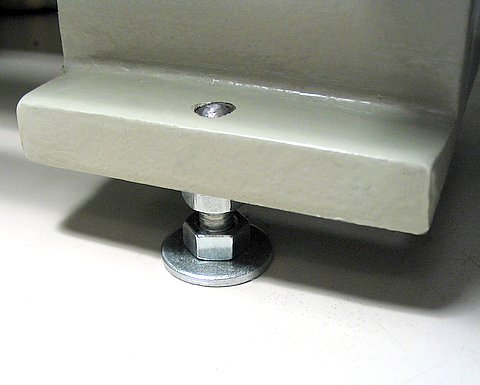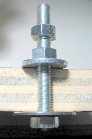 The bolt assembly with upper locking nut in relation to the plywood benchtop.