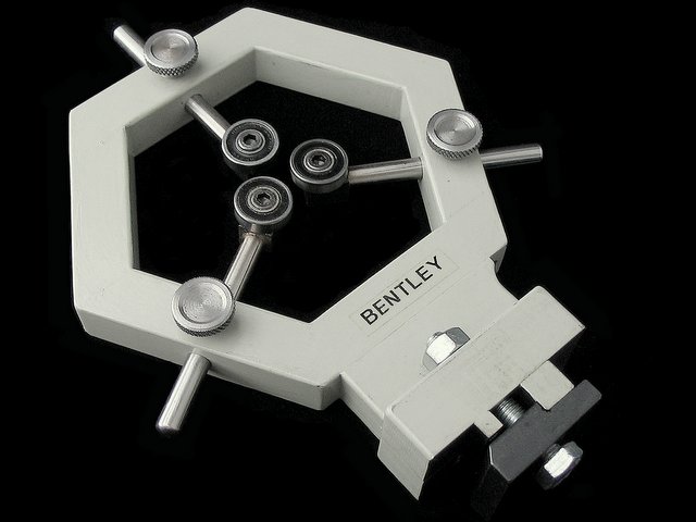A ball-bearing steady rest made from pieces of square bar and silver-soldered together.